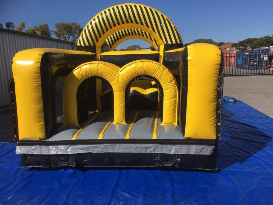 Opponents line up on each side of the inflatable, starting off with log obstacles, a rock climb, down a slide, then crawl their way through a tube to the center of the course. This takes players through pop ups and then to a double climb where the winner finishes at the bottom of a 3mtre Dual lane slide!