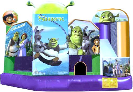 Shrek 5 in 1 Combo is a great inflatable that incorporates climbing, sliding, bouncing and basketball all in one incredible play structure.