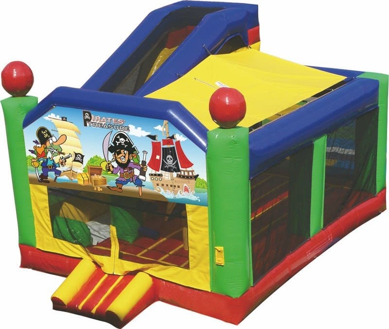 5 in 1 Pirate Combo is a great inflatable that incorporates climbing, sliding, bouncing and basketball all in one incredible play structure.