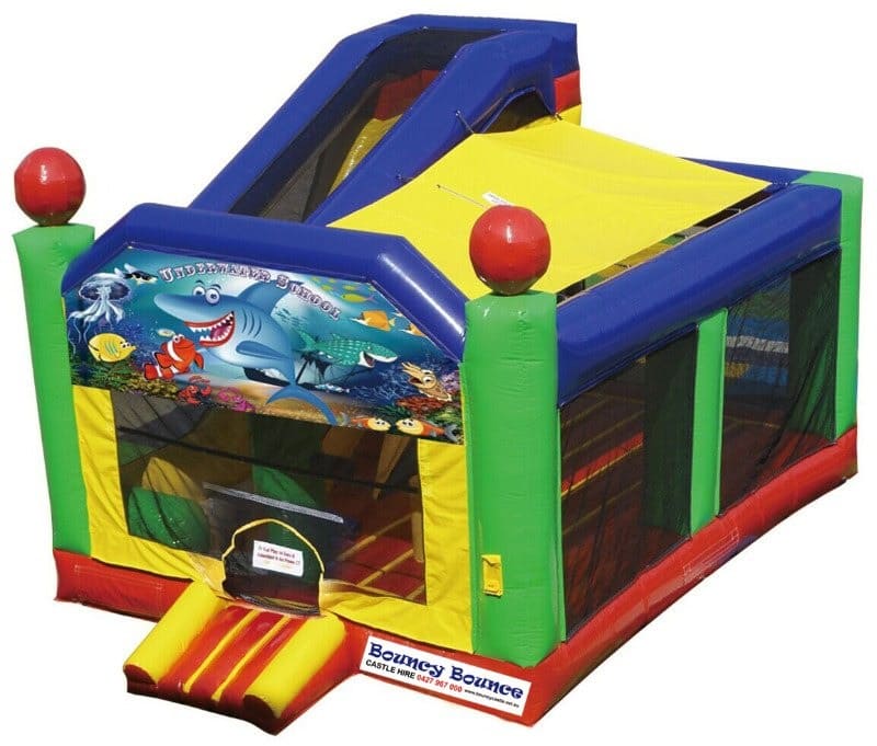 5 in 1 Shark Combo is a great inflatable that incorporates climbing, sliding, bouncing and basketball all in one incredible play structure.