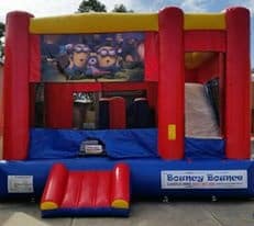 Minions 4 in 1 combo game is a great inflatable that incorporates climbing, sliding, bouncing and basketball all in one incredible play structure.