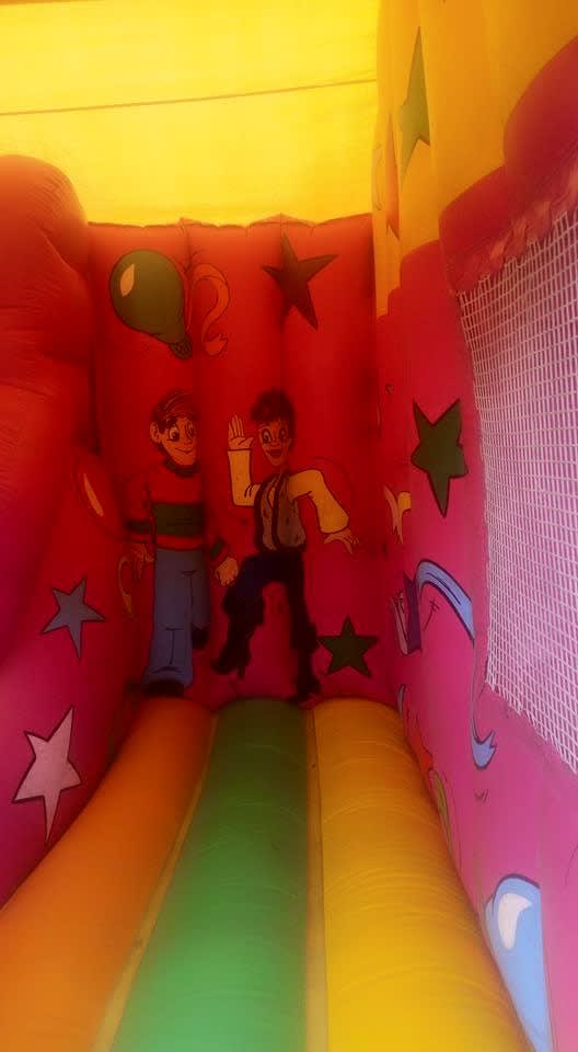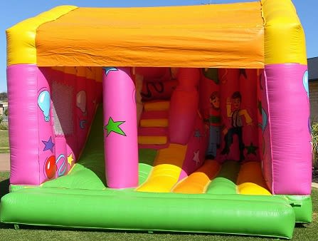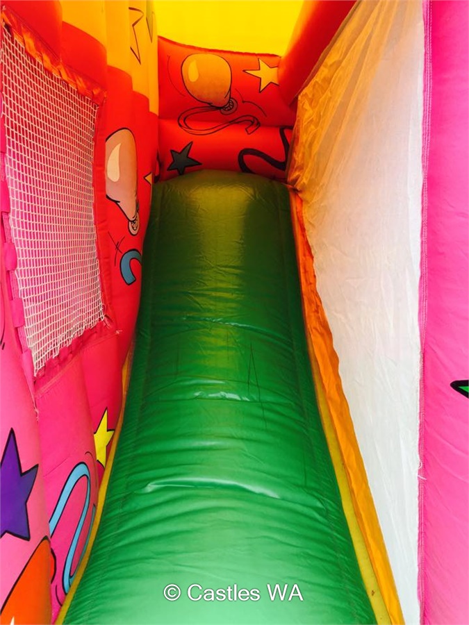 Party on Combo this one requires a space of 5m x 5m, features bounce area and a slide also has a cover over the top for protection from the sun/light rain
