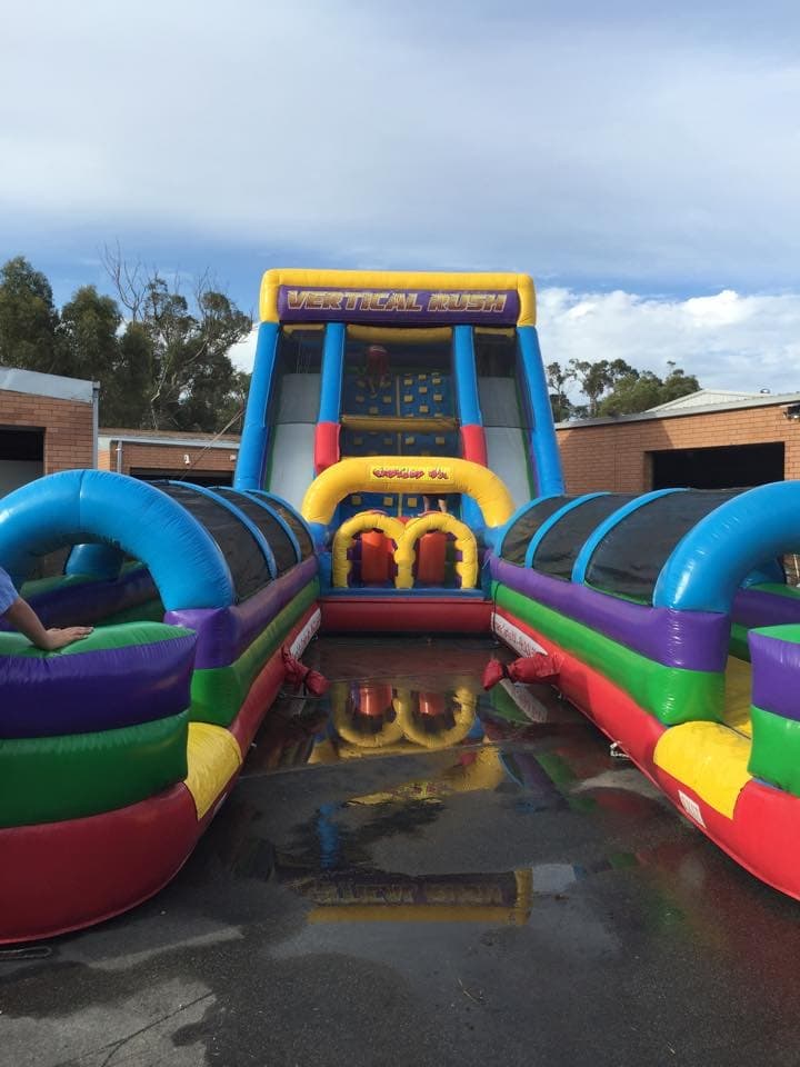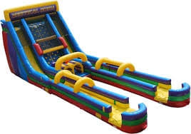 Giant Double Water Slide with Obstacles at the entrance, taking you up a rock climb wall to the top of two steep drop slides giving you an awesome ride down the slide and onto the slip and slides. Race your mates side by side.