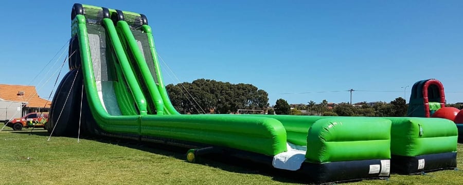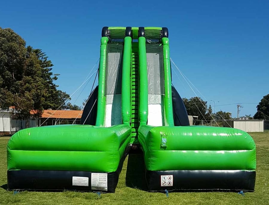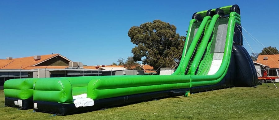 If you want a Party to remember and you have the space for this massive water slide, you wont find better in Perth, With a 60 degree accelerating incline of straight drop to the bottom then down along the double slip and slides all the way to the end.