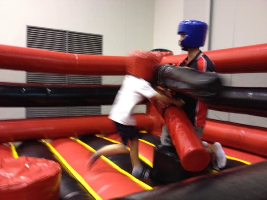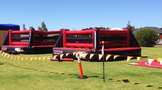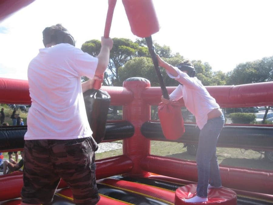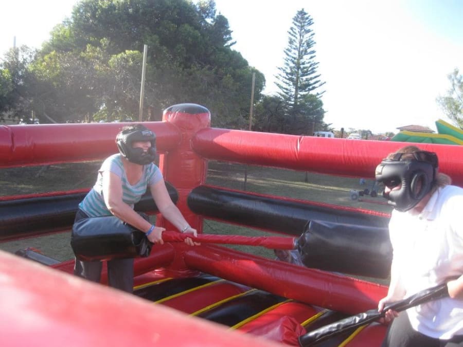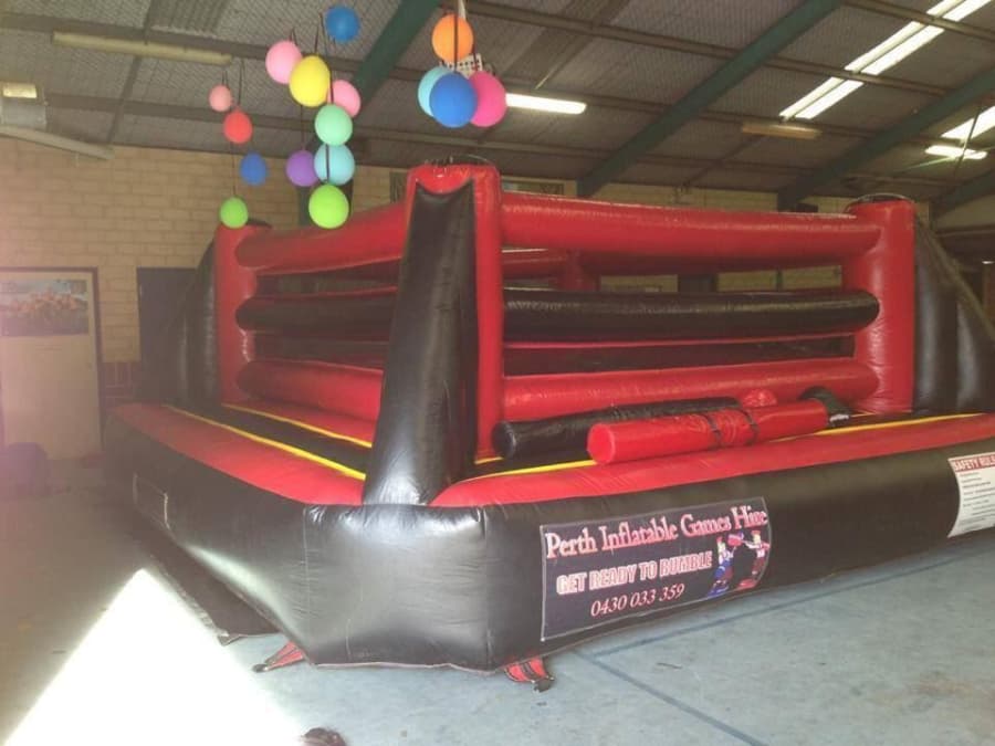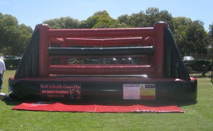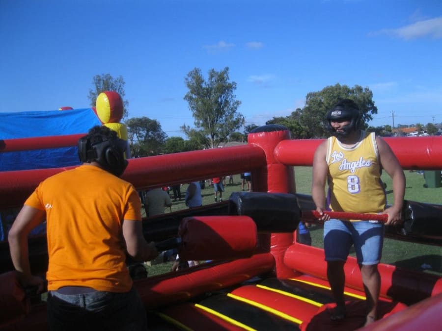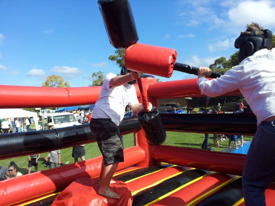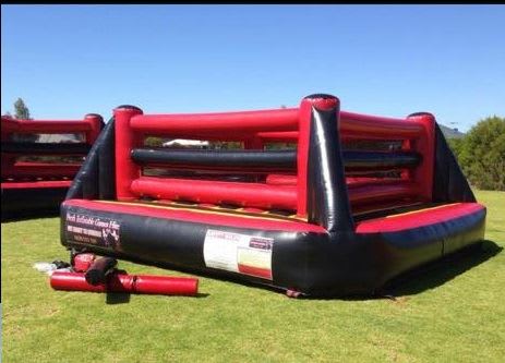 Large Inflatable Gladiator Ring. Podiums are not inflatable and go all the way to the ground. Joust sticks and protective helmets provided